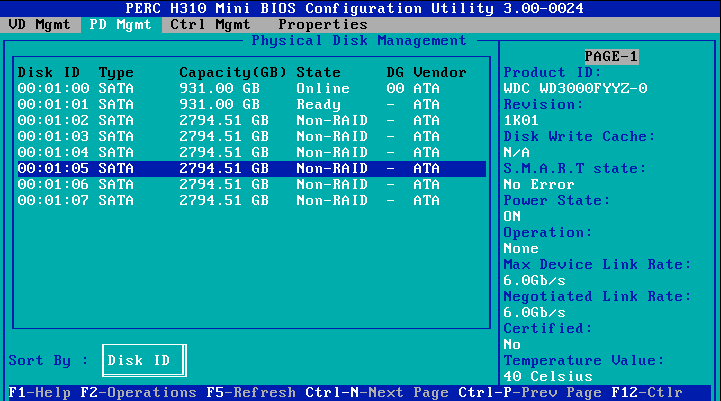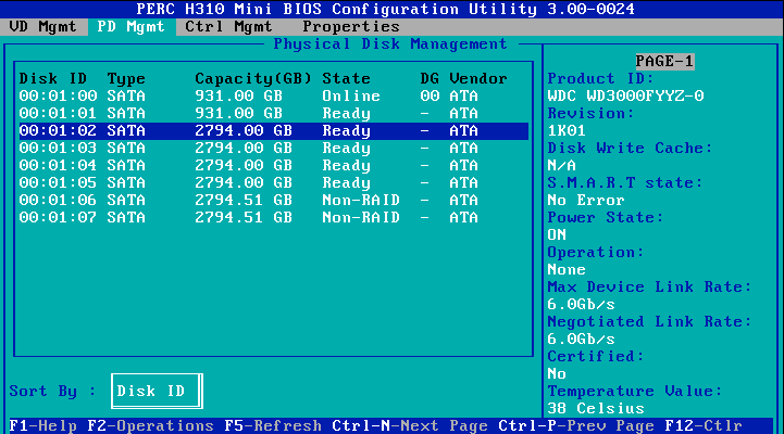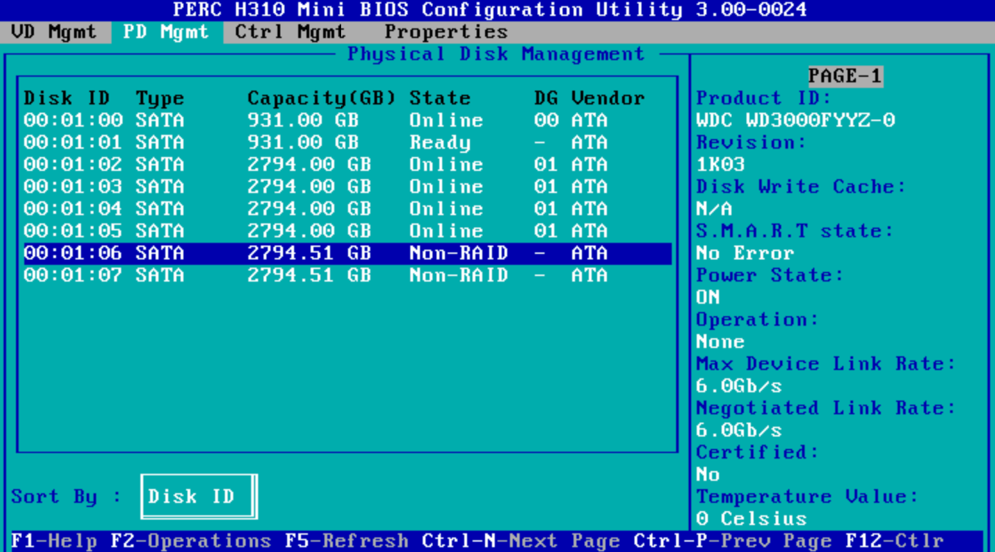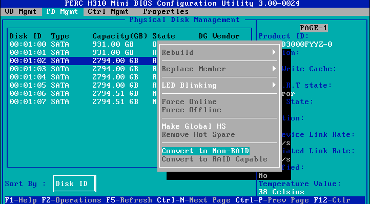 Even though the virtual disk has been deleted, the 4 disks are still “Ready” for usage in hardware RAID and need to be converted to Non-RAID. Converting to Non-RAID is a single action per disk.
