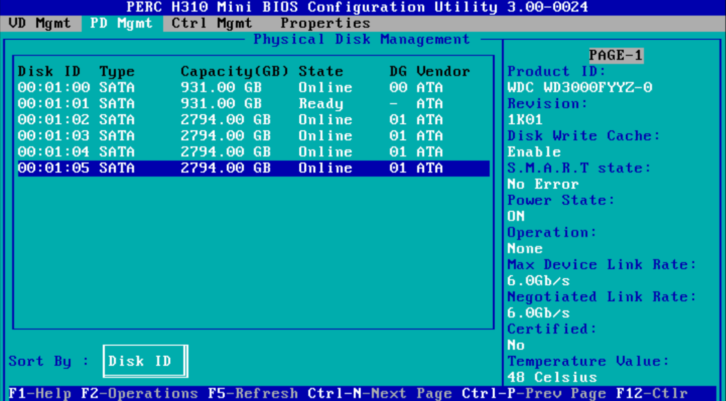 The first step is the easiest, mostly because there’s no risk. I’m replacing two old, unused desktop drives with two enterprise drives. I reboot the R520 and press Ctrl-R while it’s booting to enter the PERC H310 BIOS. From there, on the Physical Disk Management screen I can see the old drives.