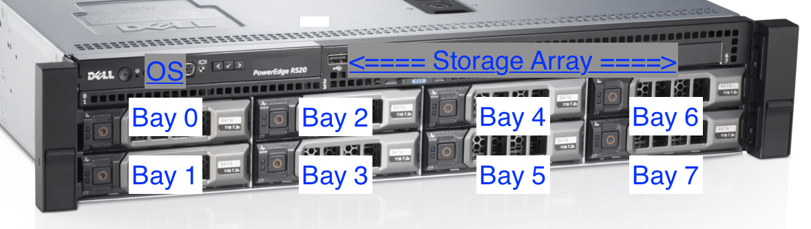 The R520 has two rows of bays. My intent is to use the first two for the operating system, and the remaining 6 for the RAID array.