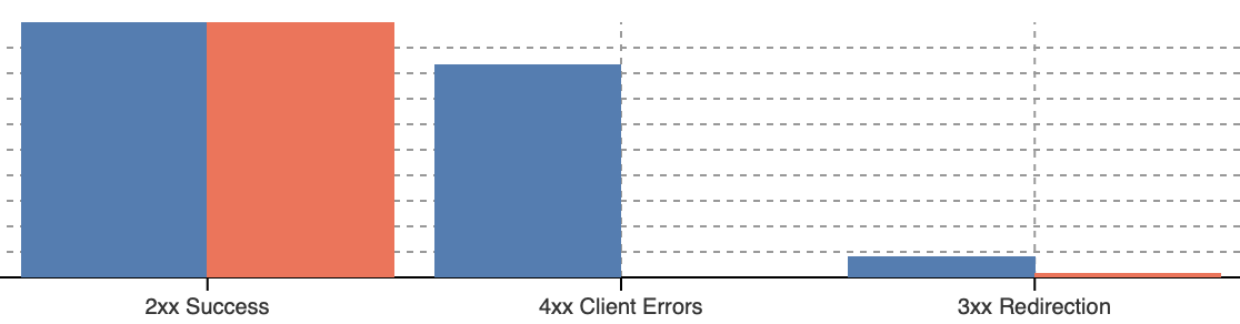 To give you a feel for how many of those bad requests there were, compare the before and after proportions. The first chart is 14 days of data, which is 12 days with HTTP/1.X and 2 days without. The second chart is only those 2 days of data with most HTTP/1.X blocked. As you can see, the shift in the proportion of errors is drastic.